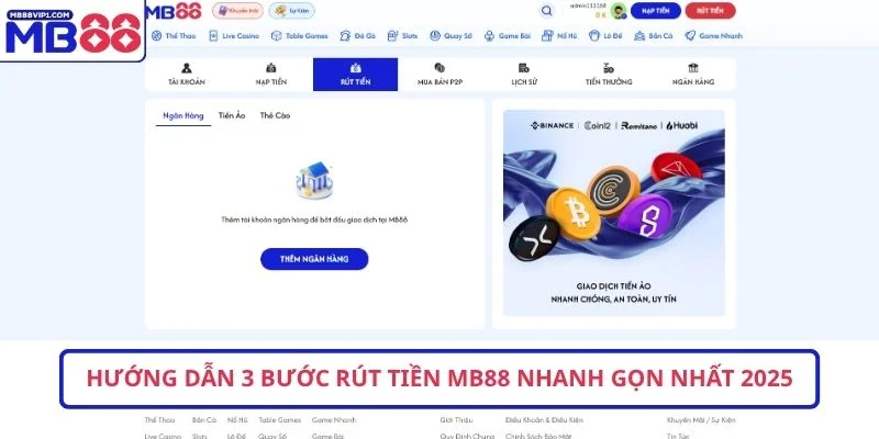Rút tiền MB88 là thao tác được nhiều người chơi quan tâm sau khi giành chiến thắng tại nhà cái. Giao dịch này được hệ thống MB88 xử lý rất nhanh chóng tiện lợi. Bài viết sau sẽ cung cấp hướng dẫn chi tiết từng bước thực hiện. Giúp bạn nhận được tiền thưởng về tài khoản ngân hàng một cách an toàn nhất.